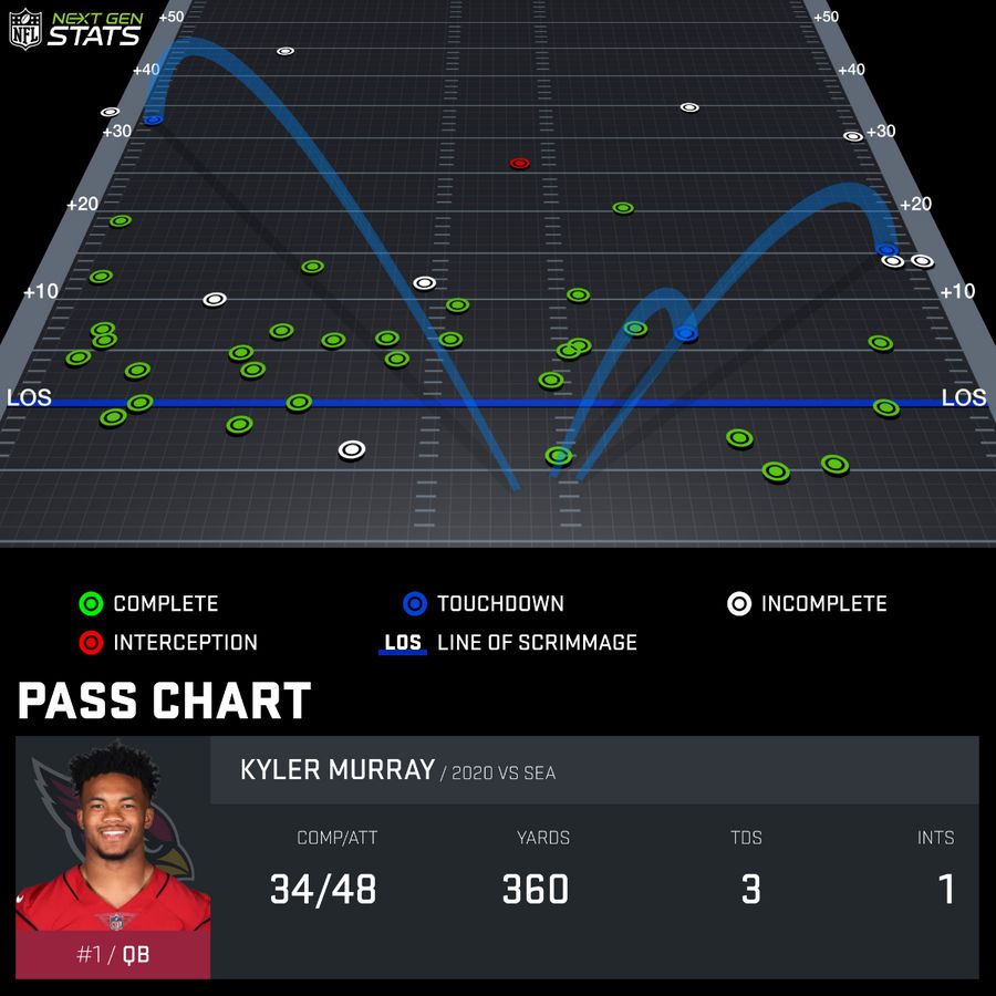 Murray started off slow compared to his elder NFC West quarterback, Russell Wilson. The Cardinals fell behind early by as many as 13, and Seattle held double-digit leads in both the third and fourth quarters. In the second half, Murray picked up. Down 10 in the third quarter, he eluded one defender for what would have been a safety, then bookended the drive with a rushing touchdown to pull the Cards within a possession. His lone mistake of the second half was a regrettable interception that offset a rare Russell Wilson pick and set the Seahawks in position to boost their lead back, but after that, Murray caught fire.