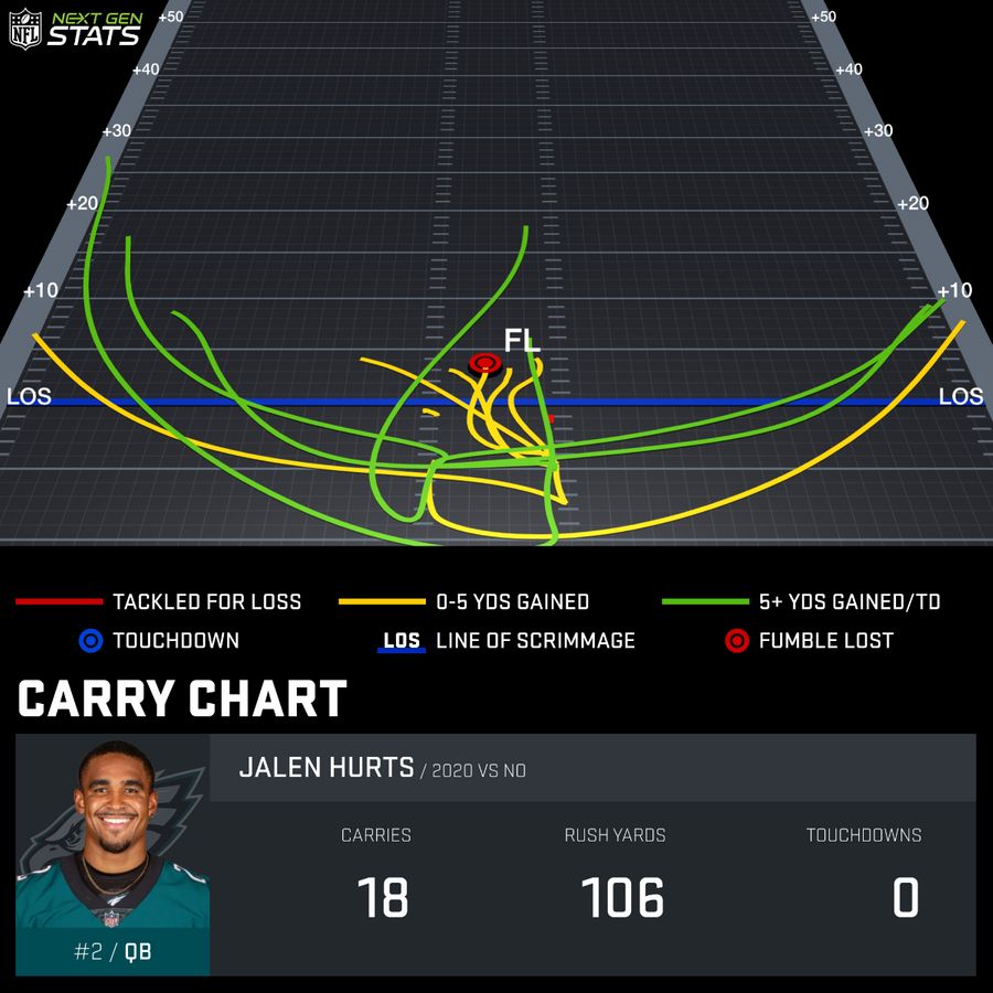Hurts was electrifying in his debut in the starting lineup playing for an offense that hasn’t had much of a spark all season. On the ground, Hurts rushed for 106 yards and formed an unstoppable two-back attack with running back Miles Sanders (115 yards, 2 touchdowns). Though Hurts had a modest 167 yards on 17 for 30 passing, he didn’t turn the ball over and found Alshon Jeffery for a highlight reel-worthy back-shoulder touchdown.