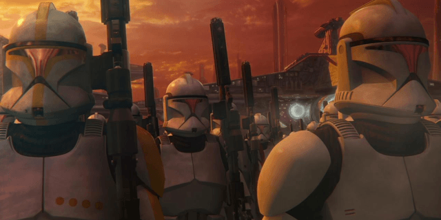 In the final act of Attack of the Clones, the new clone army saves the Jedi Order by taking over the climactic Battle of Geonosis and engaging in combat with the Separatists’ droid army. The Jedi survive, yet in the falling action, it becomes clear that the clones haven’t won the trust of the Jedi. Kenobi tells fellow Jedi Mace Windu that “without the clones, we wouldn’t have had a victory,” to which Yoda responds, “No, Obi-Wan, not victory. The shroud of the dark side has fallen. Begun, the Clone War has.” The following shot pans across millions of CGI clone troopers preparing for battle, with the “Imperial March” score (Darth Vader’s theme in Empire Strikes Back) and red tinted sky foreshadowing the clones’ insidious purpose.