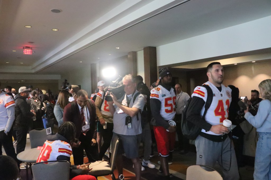 But I needed to get Spagnuolo first. I came in with a couple backup story ideas (including literally, with one focusing on the role of backup quarterbacks) but planned to go for Spags first, so that I could pivot if that fell through. My voice quivering, I slipped in a question to Chiefs head coach Andy Reid that he skirted slightly — though with some usable soundbites — then stuck around in the main press conference room as coaches filed in. I made a beeline to my target and sat down for a one-on-one conversation. Spagnuolo asked me where I was from and about my class trip, then answered every one of my questions with candor and humor. I especially appreciated his attention to little details, such as the difference in hotels between Super Bowls XLII and LVII, that played major roles in the story. With such a strong interview, I felt confident in committing to Spagnuolo as my story from the day. I then used the help of the team around me (the KC comms team) to locate secondary coach Dave Merritt, who had been a secondary coach on that XLII defense as well. For player interviews, I talked with Chris Jones, rookie corner Jaylen Watson and soon-to-be Super Bowl hero Nick Bolton.