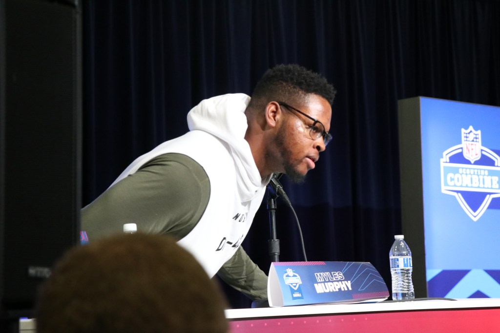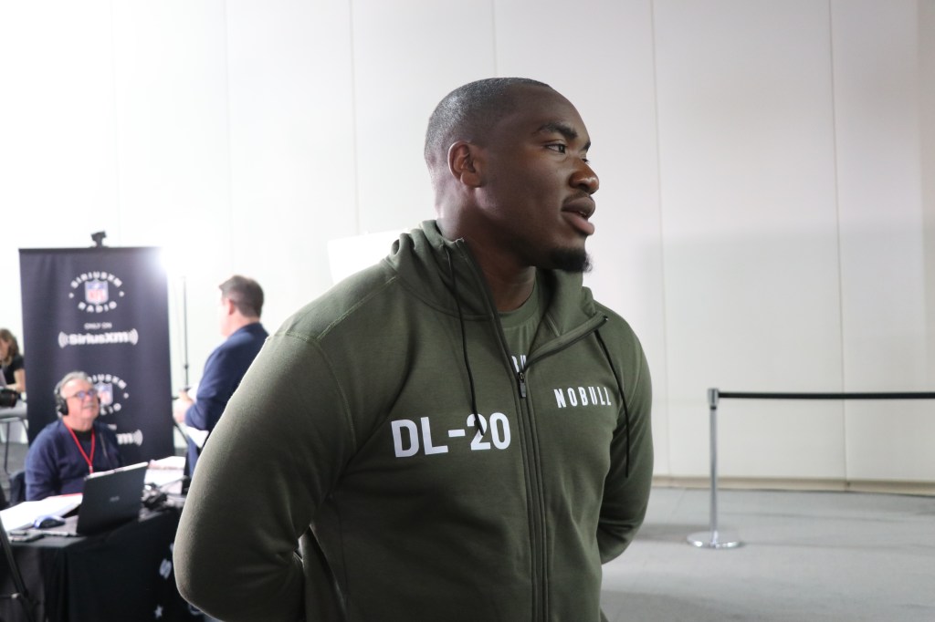 Clemson defensive end Myles Murphy leans in to hear a question. Murphy and Damascus, Md. product Bryan Bresee are candidates for the top 10 of the NFL Draft.