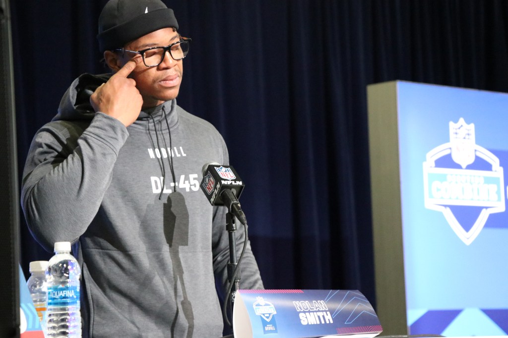 Georgia edge rusher Nolan Smith pauses during an emotional answer. Reporters pressed Smith and other Georgia products about a deadly crash during the offseason involving multiple members of the UGA program.