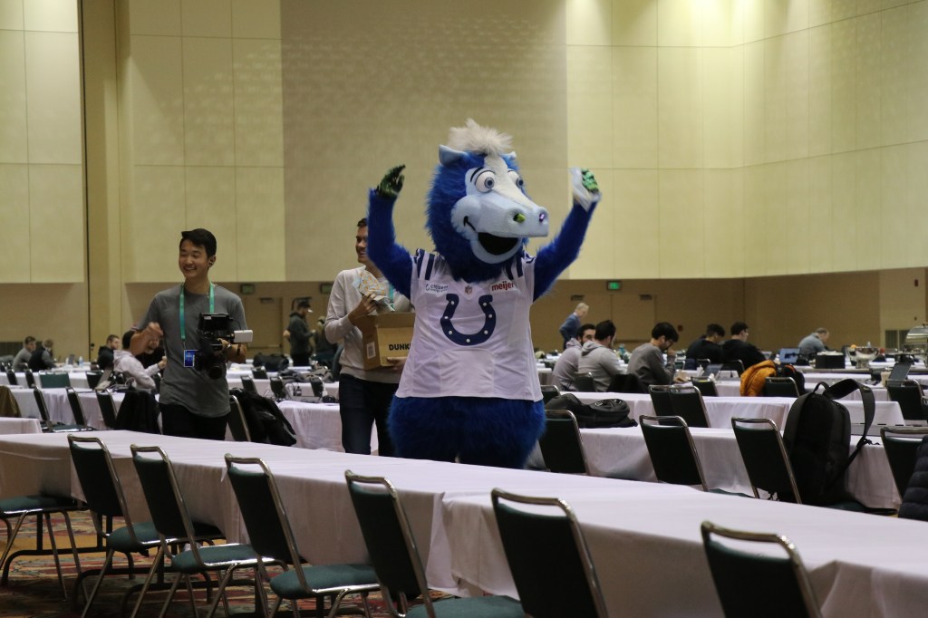 Indianapolis Colts mascot Blue passes out snacks to media members in the Indiana Convention Center’s media workroom.