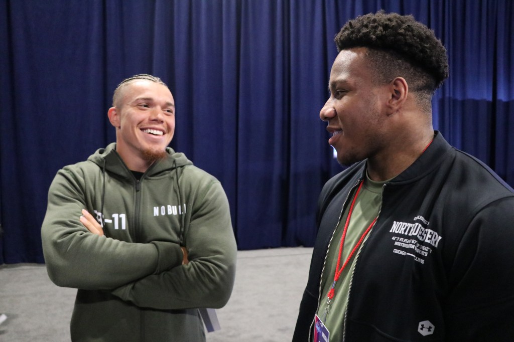 Former Northwestern players RB Evan Hull and DB Tyler Haskins catch up at the NFL Combine. Hull had a standout performance in the running backs group on the combine’s final day, while Haskins covered the combine for The Draft Network as a member of the media.