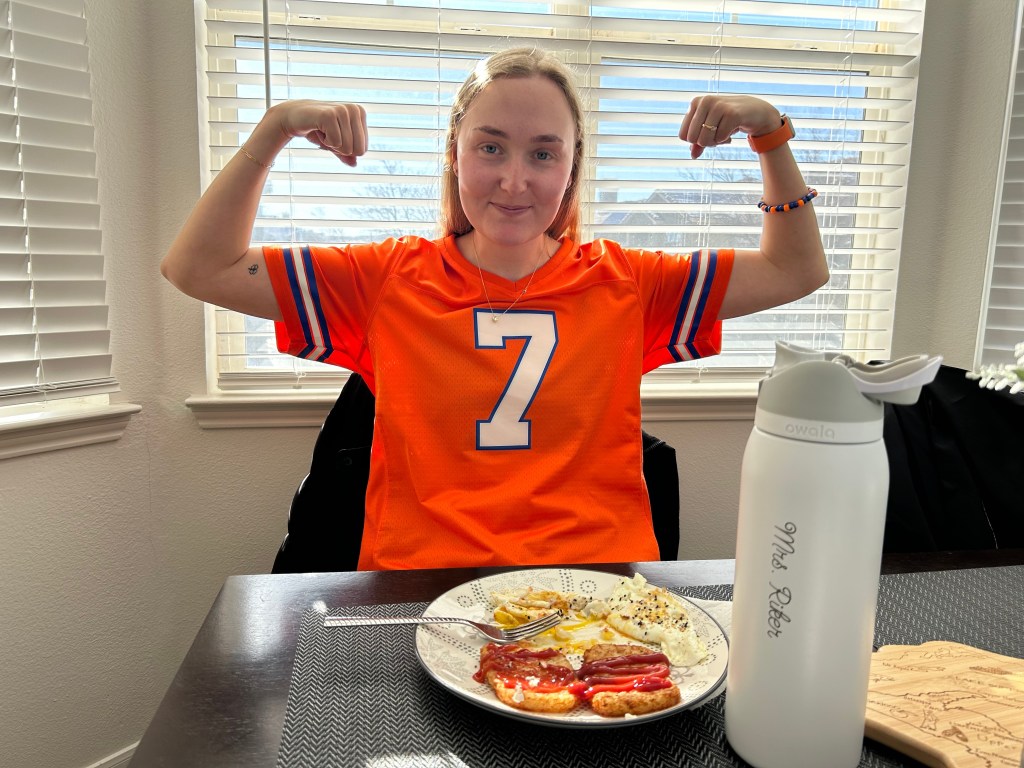 The treat on top was heading over to Mandy’s apartment, where we caught up on our previous nights (I covered an Avalanche hockey game for the Guerilla Sports media brand, while Mandy caught up with college friends). Mandy was already in full Broncos mode with her John Elway throwback jersey and new Broncos sweatpants, while I was geared up in my light blue suit and orange bow tie (the same outfit I wore to my first Broncos regular season game back in September 2023!). Mandy was very confident in the Broncos’ chances and had a nachos dinner lined up with her parents for the game.