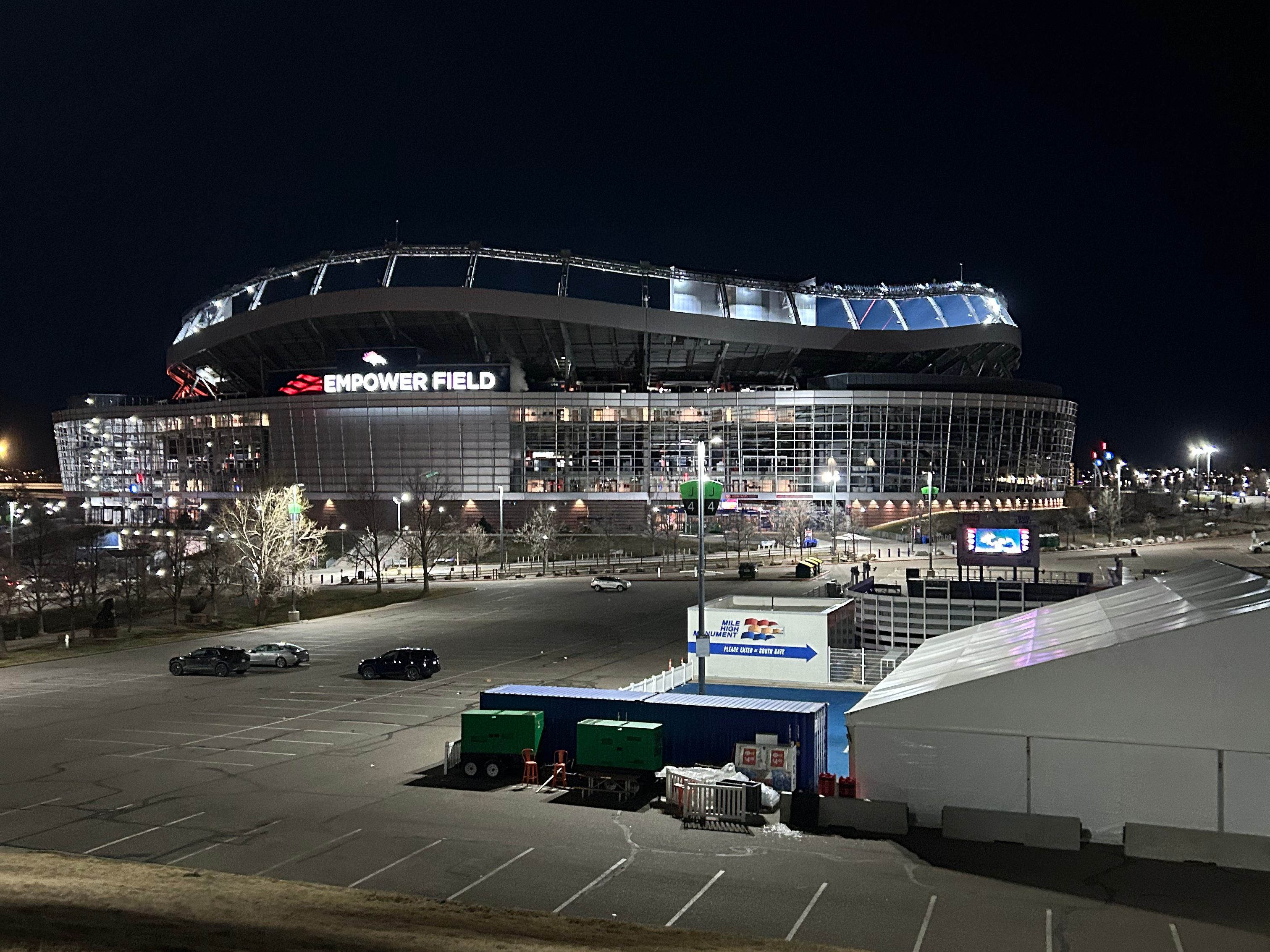 Mandy and I took pictures of our respective game-day fits with my new camera before we drove off to our respective destinations. Traffic was not oppressive on the Denver highways, but the roads inside the stadium complex took some time to navigate as a steady stream of Broncos and Bills fans prepared to tailgate and enter the stadium. I carefully navigated my designated parking lot, which had plenty of tailgaters and corn hole games set up, and parked in a spot with a great view of the stadium. Commute secured and completed, I grabbed my college backpack and descended down a hill toward the entrance of Empower Field at Mile High.